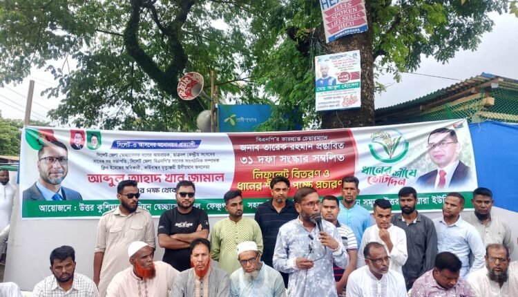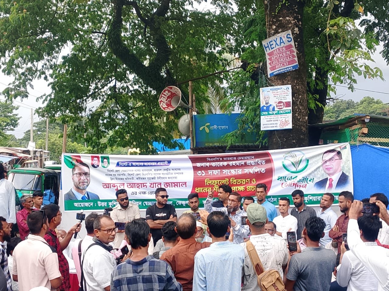 সিলেট – ৩ আসনের মনোনয়ন প্রত্যাশী সিলেট জেলা স্বেচ্ছাসেবক দলের আহবায়ক, ছাত্রদল কেন্দ্রীয় সংসদের সাবেক সহ সভাপতি, সিলেট জেলা বিএনপির সাবেক সাংগঠনিক সম্পাদক আব্দুল আহাদ খান জামাল এর পক্ষ থেকে শুক্রবার বিকেল থেকে রাত পর্যন্ত বৃষ্টি উপেক্ষা করে উত্তর কুশিয়ারা ইউনিয়নের কটালপুর বাজারে বিএনপির ভারপ্রাপ্ত চেয়ারম্যান জনাব তারেক রহমান ঘোষিত রাষ্ট্র কাঠামো মেরামতের জন্য ৩১ দফা সংস্কার সংবলিত লিফলেট বিতরণ ও ধানের শীষের পক্ষে প্রচারণা চালানো হয়।