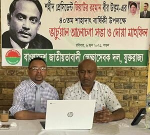 গত ৬ জুন ২০২১ইং রবিবার বিএনপির প্রতিষ্ঠাতা শহীদ প্রেসিডেন্ট জিয়াউর রহমান এর ৪০ তম শাহাদাৎ বার্ষিকী উপলক্ষে যুক্তরাজ্য স্বেচ্ছাসেবক দলের পক্ষ থেকে আলোচনা ও দোয়া মাহফিল অনুষ্ঠিত হয়।রোববার বিকাল ৪টায় অনুস্টিত ভার্চুয়াল আলোচনা সভায় প্রধান অতিথির বক্তব্য রাখেন বিএনপির জাতীয় স্তায়ী কমিটির অন্যতম সদস্য সাবেক রাস্টদুত নজরুল ইসলাম খাঁন।প্রধান বক্তা শামসুজ্জামান দুদু বিশেষ অতিথী হিসেবে উপস্তিত ছিলেন এম এ মালেক, আব্দুল কাদের ভুঁইয়া জুয়েল,এবং যুক্তরাজ্য বিএনপির সাধারন সম্পাদক কয়ছর এম আহমেদ।
