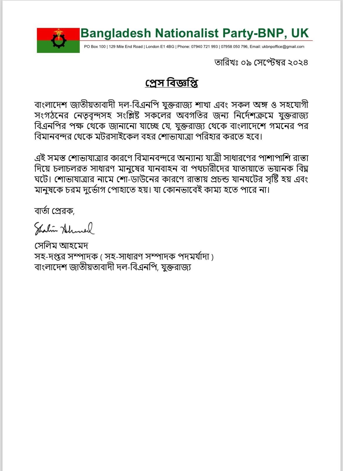 বাংলাদেশ জাতীয়তাবাদী দল-বিএনপি যুক্তরাজ্য শাখা এবং সকল অঙ্গ ও সহযোগী সংগঠনের নেতৃবৃন্দসহ সংশ্লিষ্ট সকলের অবগতির জন্য নির্দেশক্রমে যুক্তরাজ্য বিএনপির পক্ষ থেকে জানানো যাচ্ছে যে, যুক্তরাজ্য থেকে বাংলাদেশে গমনের পর বিমানবন্দর থেকে মটরসাইকেল বহর শোভাযাত্রা পরিহার করতে হবে।