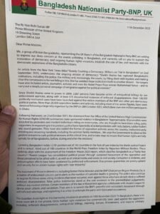 মাননীয় প্রধানমন্ত্রী, আমরা, ব্রিটিশ বাংলাদেশীদের একটি দল, বাংলাদেশ জাতীয়তাবাদী দল-বিএনপির যুক্তরাজ্য শাখার প্রতিনিধিত্ব করছি, বাংলাদেশে ঘটে যাওয়া ঘটনাগুলিতে আমাদের গভীর উদ্বেগ প্রকাশ করতে এবং গণতন্ত্র পুনরুদ্ধার, চলমান মানবাধিকারের অবসানে সমর্থন করার জন্য আন্তরিকভাবে আপনাকে আহ্বান জানাচ্ছি। লঙ্ঘন, আইনের শাসন প্রতিষ্ঠা এবং বাংলাদেশী নাগরিকদের গণতান্ত্রিক আকাঙ্ক্ষার সাথে অনুরণিত। নিউইয়র্ক টাইমসের 2রা সেপ্টেম্বর 2023-এ “চুয়েটলি ক্রাশিং এ ডেমোক্রেসি: মিলিয়নস অন ট্রায়াল ইন বাংলাদেশ” শিরোনামের একটি নিবন্ধ, গণতন্ত্রের চলমান অবক্ষয়কে নির্দেশ করে: “শেখ হাসিনা পুলিশ, সামরিক বাহিনী এবং ক্রমবর্ধমানভাবে, বাংলাদেশের প্রতিষ্ঠানগুলিকে দখল করেছেন। আদালত, তাদের অনুগতদের দ্বারা ভরাট করে এবং লাইনে না পড়ার পরিণতিগুলিকে স্পষ্ট করে দেয়। তিনি ভিন্নমত পোষণ করার জন্য এই প্রতিষ্ঠানগুলিকে ব্যবহার করেছেন – তার লক্ষ্যগুলি শিল্পী, সাংবাদিক, অ্যাক্টিভিস্ট এবং এমনকি নোবেল শান্তি পুরস্কার বিজয়ী মুহাম্মদ ইউনুসকেও অন্তর্ভুক্ত করেছে – এবং তার রাজনৈতিক শত্রুদের বিরুদ্ধে প্রতিশোধের গভীর ব্যক্তিগত প্রচারণা চালাতে।” 2009 সালে শেখ হাসিনা ক্ষমতায় আসার পর থেকে, 2,687 জন আইন প্রয়োগকারী সংস্থার দ্বারা বিচারবহির্ভূত হত্যাকাণ্ডের শিকার হয়েছেন, যার সাথে অন্তত 675 টি নথিভুক্ত নথিভুক্ত নথিভুক্ত নথিভুক্ত নথিভুক্ত গুমের ঘটনা ঘটেছে। বিএনপি ও অন্যান্য গণতন্ত্রপন্থী রাজনৈতিক দলের ৫০ লাখ সদস্যের বিরুদ্ধে রাজনৈতিক উদ্দেশ্যপ্রণোদিত ১৩৮,৫০০টিরও বেশি মামলা দায়ের করা হয়েছে। 2023 সালের 28শে অক্টোবর বিএনপি দ্বারা আয়োজিত একটি বিশাল সমাবেশের পরে বেশিরভাগ সিনিয়র ব্যক্তিত্ব সহ 20,000 এরও বেশি বিরোধী নেতা ও কর্মীকে আটক করা হয়েছে, যা ঢাকায় এক মিলিয়নেরও বেশি অংশগ্রহণকারীকে আকর্ষণ করেছিল। সেই ঘটনার পর, 31শে অক্টোবর 2023-এ, জাতিসংঘের মানবাধিকার বিষয়ক হাইকমিশনার (ওএইচসিএইচআর) অফিসের বিবৃতিতে বাংলাদেশে রাষ্ট্রীয় মদদপুষ্ট সহিংসতার সংক্ষিপ্ত বিবরণ দেওয়া হয়েছে: “আনুমানিক 30 জন সাংবাদিক মোটরসাইকেলে চড়ে প্রতিবাদকারী এবং মুখোশধারী ব্যক্তিদের দ্বারা লাঞ্ছিত হয়েছিল, যারা তারা ক্ষমতাসীন দলের সমর্থক বলে মনে করা হয়। বিক্ষোভের প্রতিক্রিয়ায়, পুলিশ বিক্ষোভকারীদের উপর রড, লাঠিসোটা, রাবার বুলেট এবং সাউন্ড গ্রেনেড দিয়ে হামলা চালিয়েছে বলে জানা গেছে। তারা সারাদেশে বিরোধী দলের নেতাকর্মীদের বাড়িতেও অভিযান চালিয়েছে, নির্বিচারে গ্রেফতার করেছে এবং কয়েকশ’ জনকে আটক করেছে। কর্মীদের পরিবারের সদস্যদের সহ… আমরা এই সংকটময় সময়ে রাজনৈতিক উত্তেজনা রোধে সর্বোচ্চ সংযম পালনের জন্য স